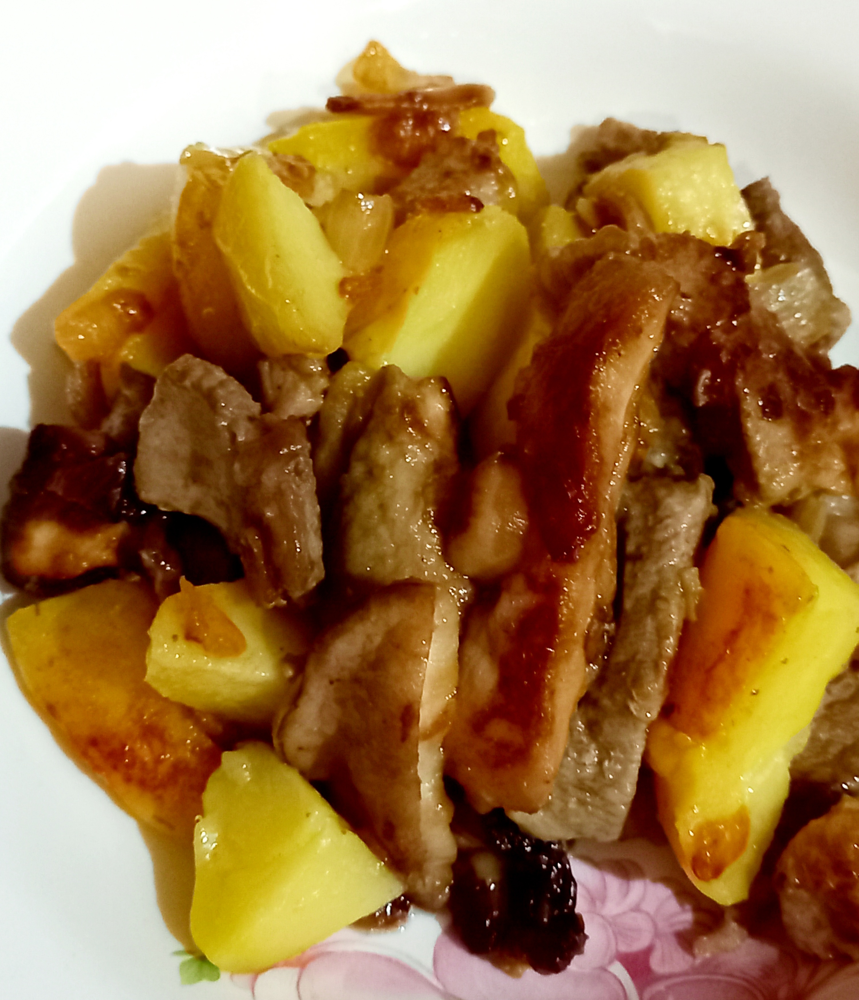 Если про с картошкой, то адаптировано под вкусы моей семьи : обжариваю мясо кусочками, добавляю морковь(тру на тёрке) лук кубиками, в это время картошка порезанная начинает вариться.Потом в мясо добавляю томатную пасту (немного) и муку 1,5ложки. С картошки сливаю часть воды, туда выкладываю мясо и всё протушиваю.Мои не любят морковку , порезанную крупно, потому никаких кружочков и ломтиков. Пробовала готовить и в горшочках , но почему то вкус другой, не так вкусно.