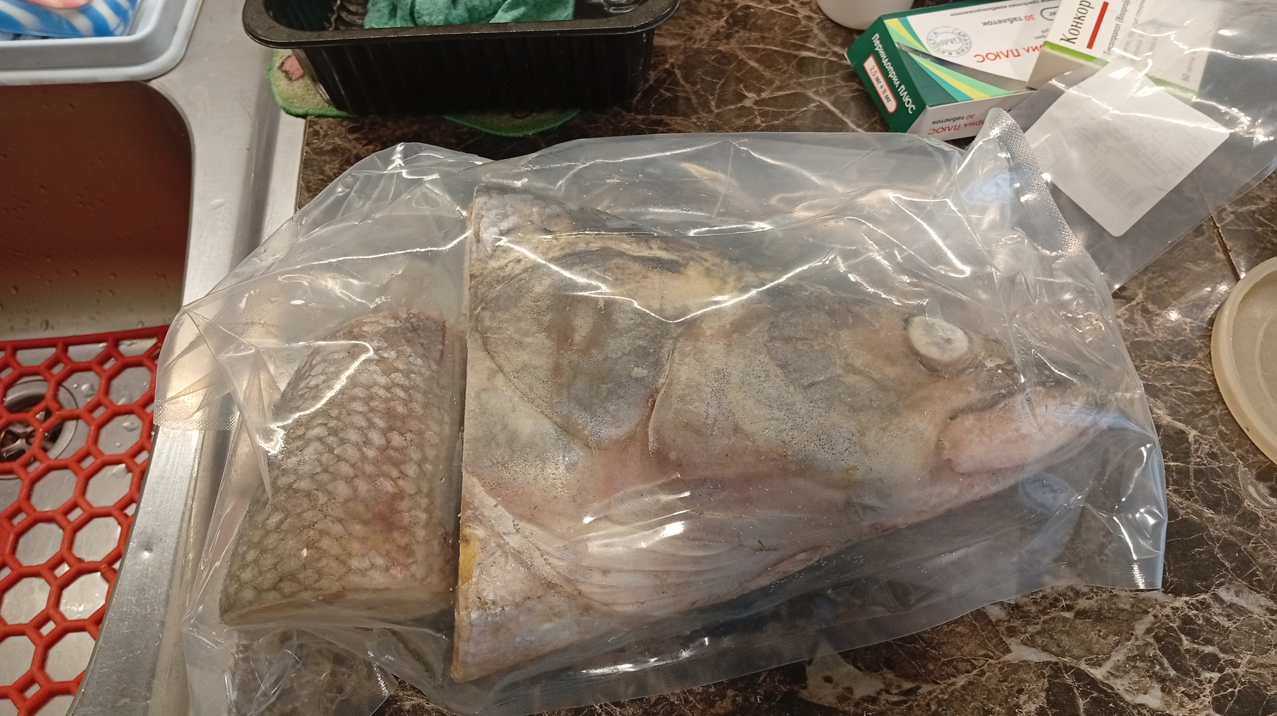 Привезли голову и хвостик нельмы, ни в одну кастрюлю это не влезает, даже в десятилитровую, вы знали, что северные речные рыбы такие огромные, полтора метра в длину и вес 20 кг?