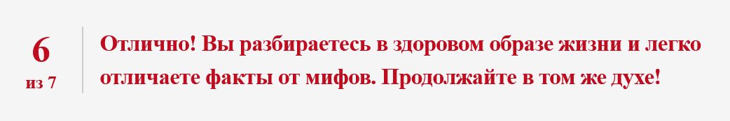 Хороший результат! Вы знаете многое о ЗОЖ, но есть несколько мифов, которые стоит проверить. Продолжайте учиться и развиваться!