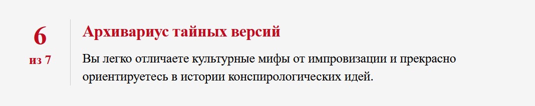 Вы легко отличаете культурные мифы от импровизации и прекрасно ориентируетесь в истории конспирологических идей.